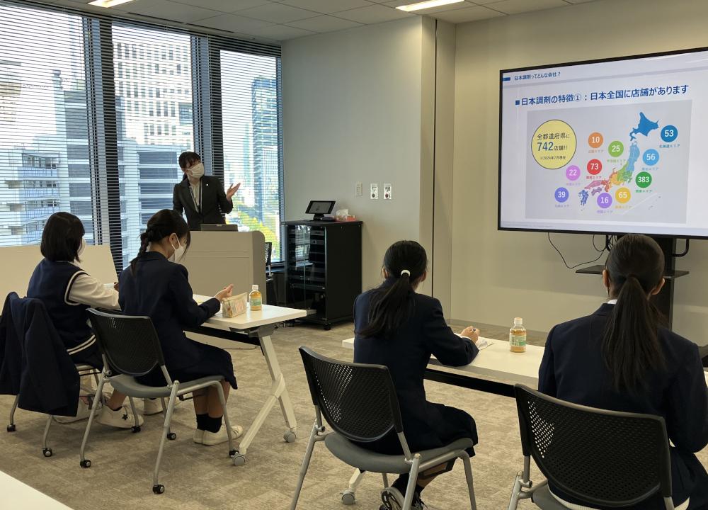 日本調剤の 本社で薬局薬剤師の役割や日本調剤の事業について講義を実施。当社の『SDGsラジオ』を聴いて薬剤師という職業に興味を持ったという学生もおり、薬剤師になるための具体的なステップについても紹介しました。また、『SDGsラジオ』で得た知見をもとに、学生が日本調剤の新しいサービスを考え、提案するなど、当社の強みや現代の学生が求めるヘルスケアサービスについて活発な意見交換を行いました。