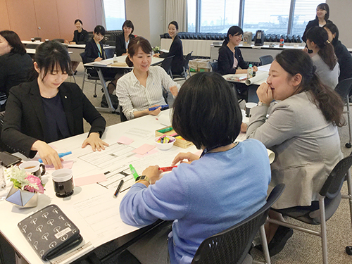 In February 2020, we held the second career design training session as the final round of the work-life balance support project for female employees working at headquarters and the Yokohama Branch who are currently raising children. The goal of this training was to have participants clarify the direction of their careers by promoting a more forward-looking vision in the current “child-rearing” stage of their lives, and also to build a network of female employees who are raising children. We hope that the participants will demonstrate their presence in their respective departments and further grow as role models by making the most of the networks cultivated through the year-long efforts.