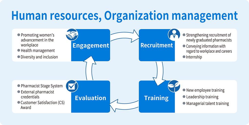 Recruiting human resources, starting with pharmacists, is critical. These are the people that offer high-quality pharmacy services and heighten our competitive capabilities, thus leading to the organizations’ expansion. We are striving to strengthen our ability to recruit pharmacists, certified dieticians, medical administrators and administrative department personnel, both as new graduates and mid-career hires, in order to respond to changes in the external environment such as revisions to laws and industry restructuring.