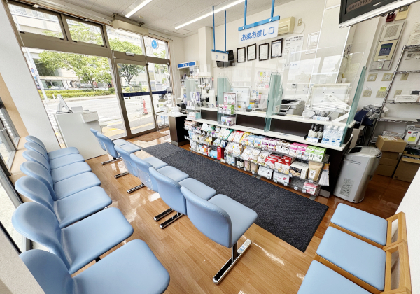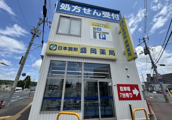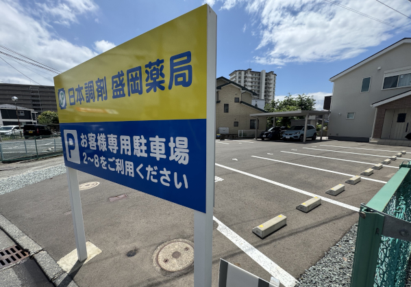 県立中央病院の正面の黄色い看板が目印です。第1類医薬品などの一般用医薬品(市販薬)・自己血糖測定器・排卵日検査薬などの取り扱いを行っています。お薬のこと、健康管理のことなど、お気軽にご相談ください。